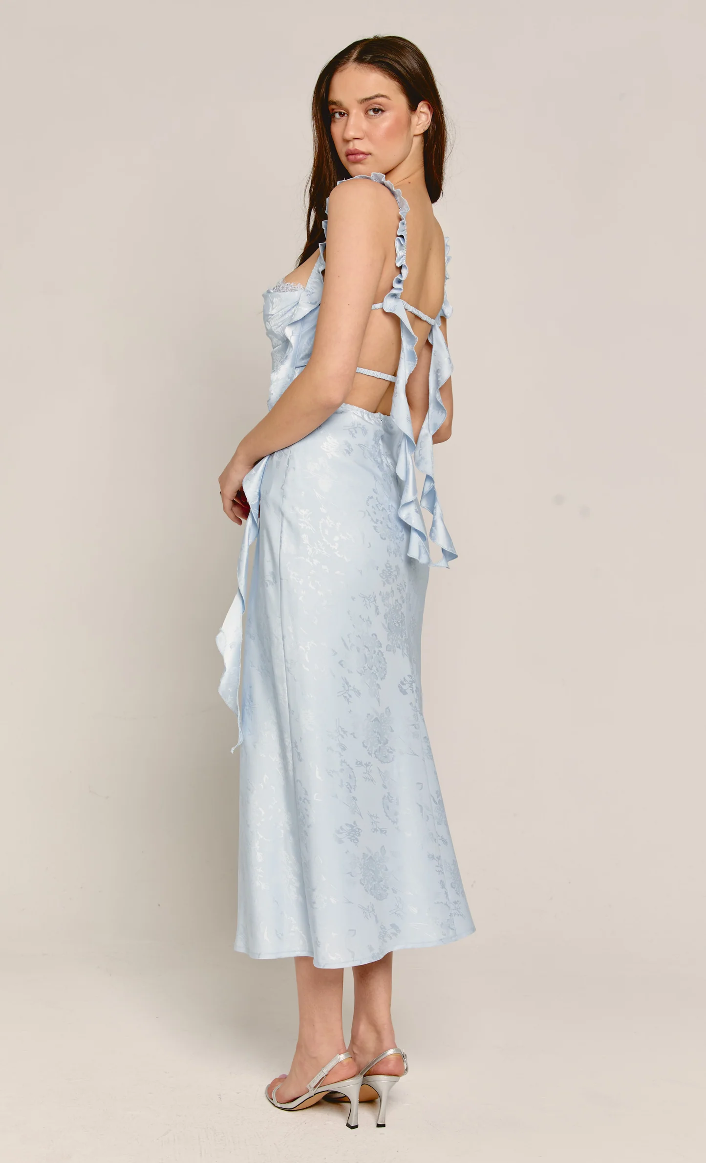 Rare London Baby Blue Satin Jacquard Cup Maxi Dress – €155.95